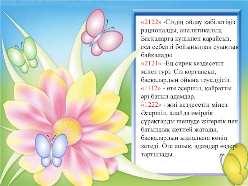 Слайд 8«2122» -Сіздің ойлау қабілетіңіз рационалды, аналитикалық. Басқаларға күдікпен қарайсыз, сол себепті