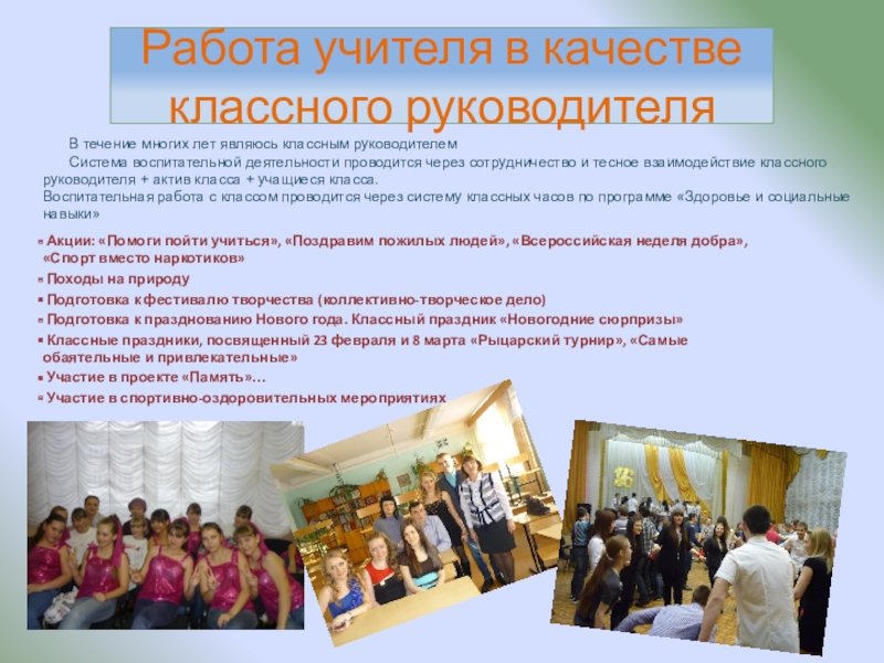 Система воспитательной деятельности проводится через сотрудничество и тесное взаимодействие классного руководителя + актив класса + учащиеся класса.