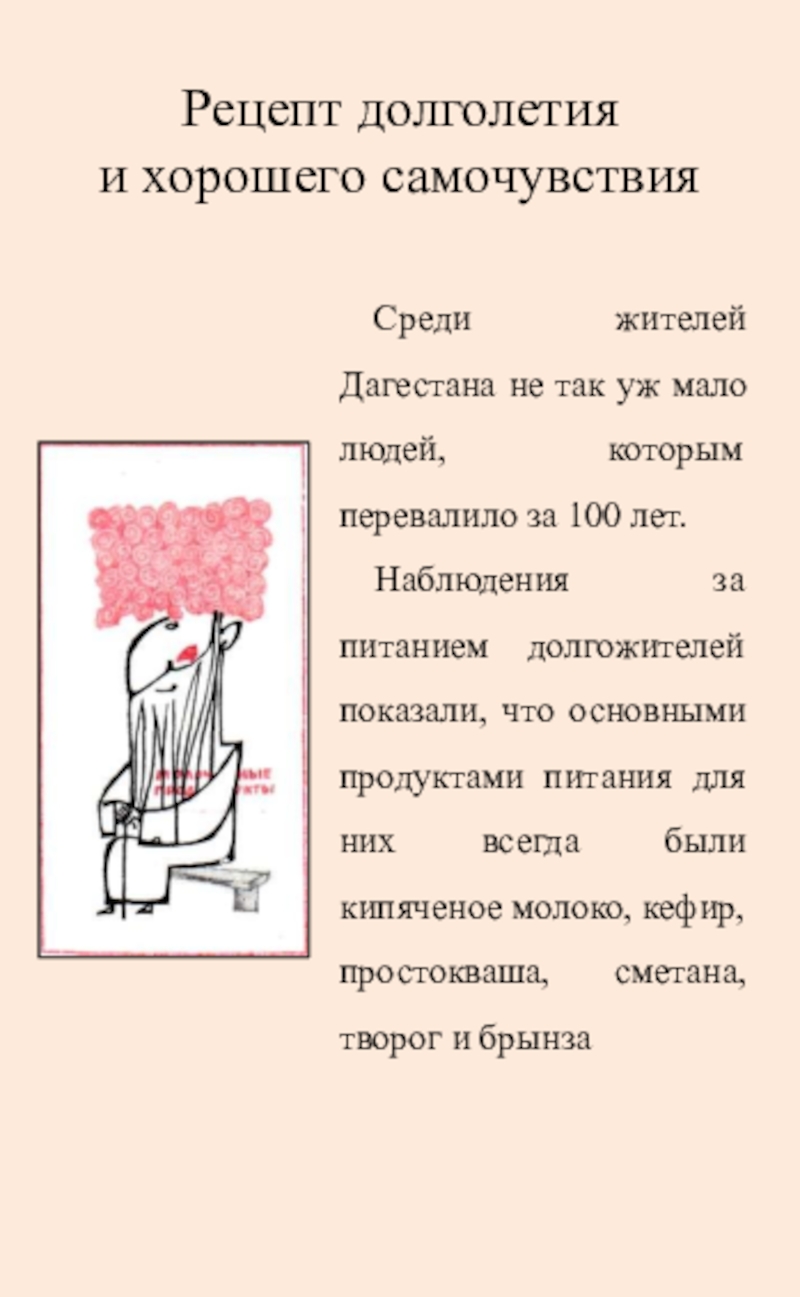 Наблюдения за питанием долгожителей показали, что основными продуктами питания для них всегда были кипяченое молоко, кефир, простокваша, сметана, творог и брынза