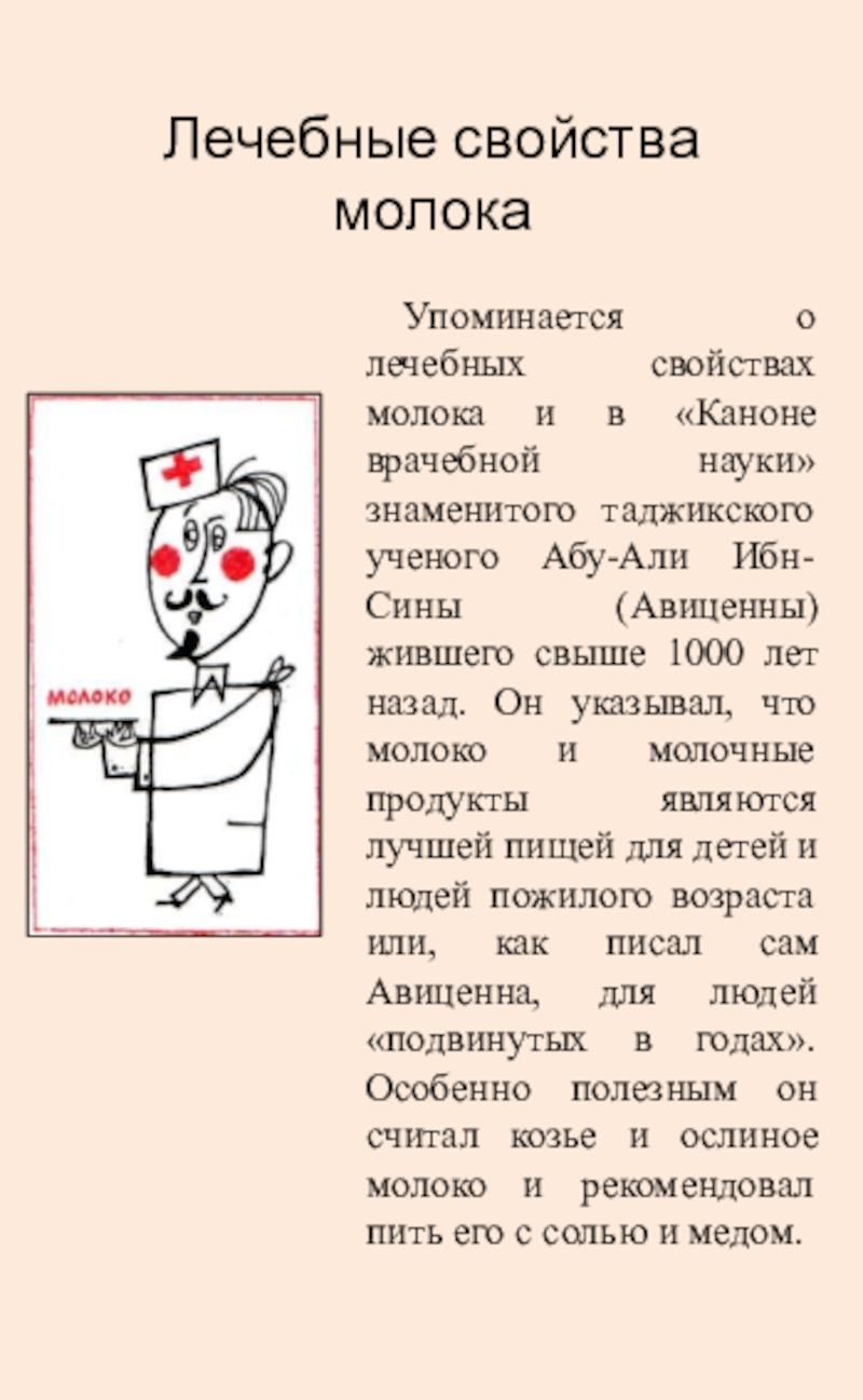 науки» знаменитого таджикского ученого Абу-Али Ибн-Сины (Авиценны) жившего свыше 1000 лет назад. Он указывал, что молоко и молочные продукты являются лучшей пищей для детей и людей пожилого возраста или, как писал сам Авиценна, для людей «подвинутых в годах». Особенно полезным он считал козье и ослиное молоко и рекомендовал пить его с солью и медом.