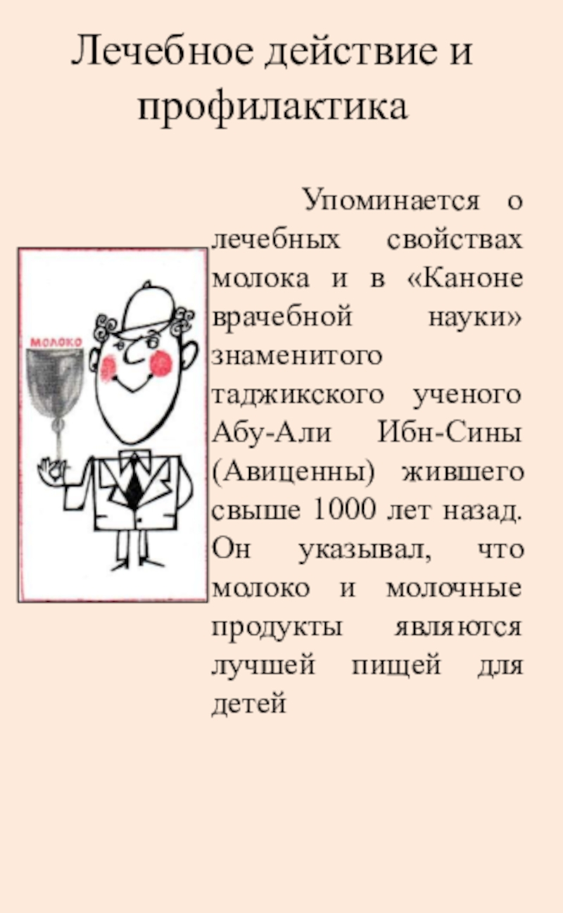 в «Каноне врачебной науки» знаменитого таджикского ученого Абу-Али Ибн-Сины (Авиценны) жившего свыше 1000 лет назад. Он указывал, что молоко и молочные продукты являются лучшей пищей для детей