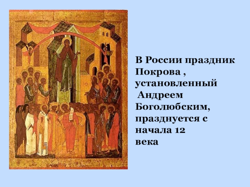 В России праздник Покрова , установленный Андреем  Боголюбским,празднуется с начала 12 века