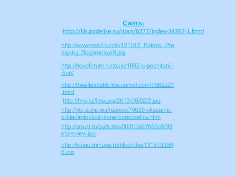Сайты http://lib.podelise.ru/docs/6277/index-34267-1.htmlhttp://www.nsad.ru/pic/121012_Pokrov_Presvjatoj_Bogorodicy/9.jpghttp://nevaforum.ru/topic/1882-o-pochitanii-ikon/http://theallexbekk.livejournal.com/7662227.htmlhttp://hvs.kz/images/2013/09/02/2.jpghttp://vip-zone.ws/raznoe/79626-ckazanie-o-bladimipckojj-ikone-bogopodicy.htmlhttp://crosti.ru/patterns/00/01/a6/f693a90f8e/preview.jpghttp://blago.minusa.ru/blog/blog1318733996.jpg