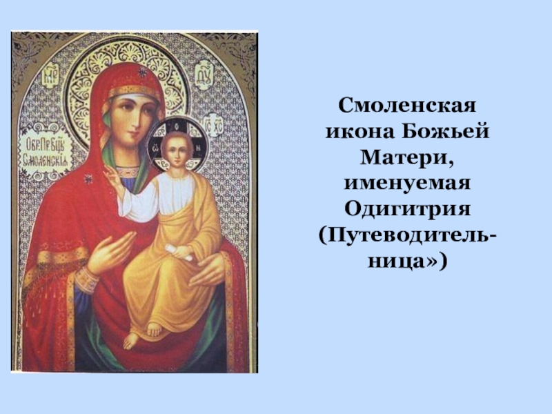 Слайд 11Смоленская икона Божьей Матери, именуемая Одигитрия (Путеводитель-ница»)