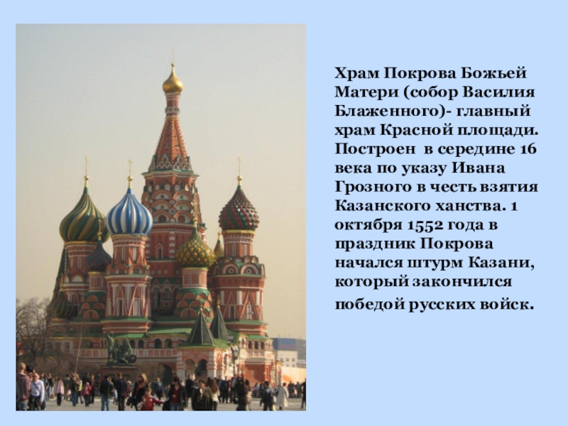 Слайд 5Храм Покрова Божьей Матери (собор Василия Блаженного)- главный храм Красной площади.