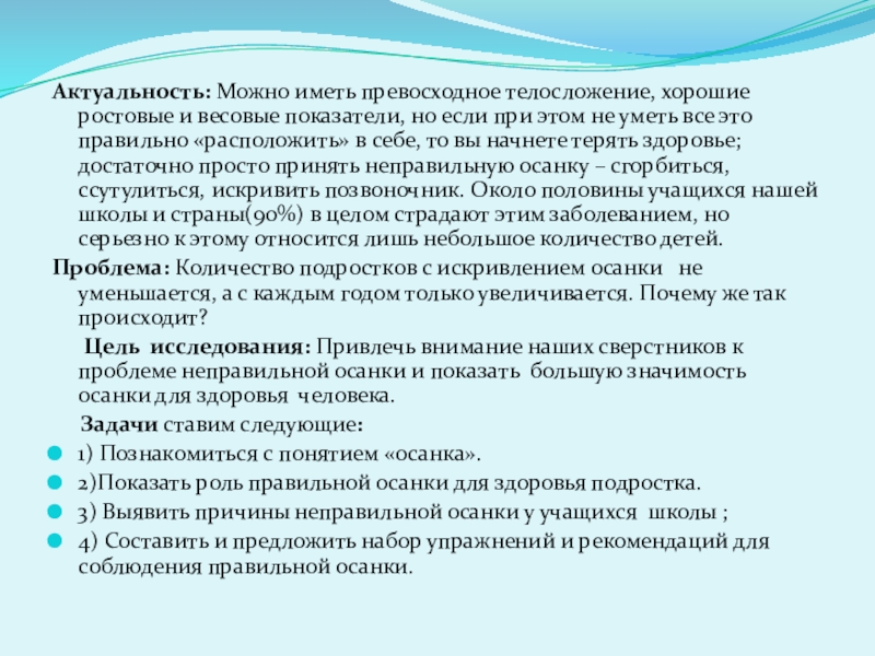 Цель исследования: Привлечь внимание наших сверстников к проблеме неправильной осанки и показать большую значимость осанки для здоровья человека.