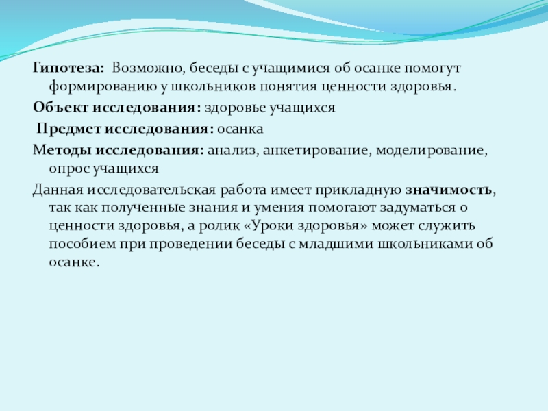 Слайд 3Гипотеза: Возможно, беседы с учащимися об осанке помогут формированию у школьников