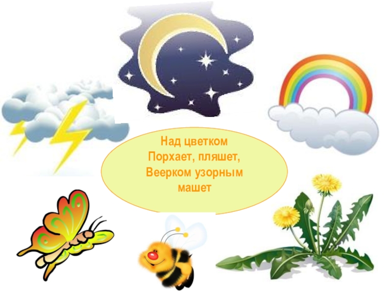 Слайд 11Над цветком Порхает, пляшет, Веерком узорным машет