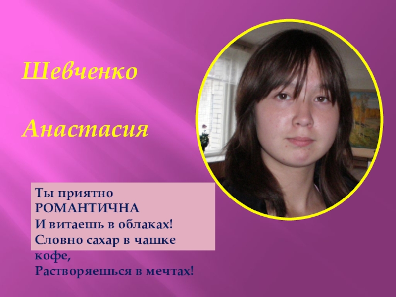 Шевченко   АнастасияТы приятно РОМАНТИЧНАИ витаешь в облаках!Словно сахар в чашке кофе,Растворяешься в мечтах!
