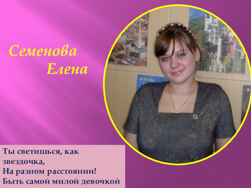 Семенова      Елена Ты светишься, как звездочка,На разном расстоянии!Быть самой милой девочкойХорошее призвание!