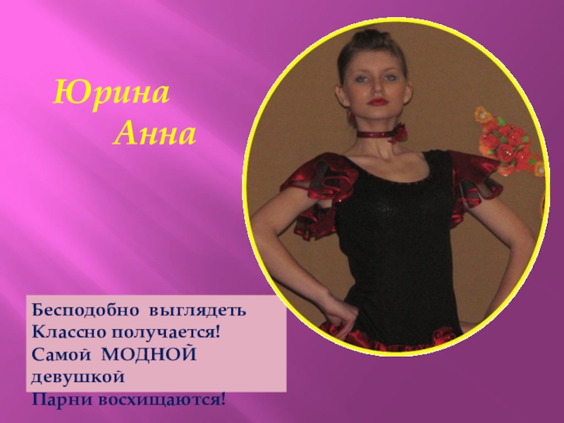 Юрина     Анна Бесподобно выглядетьКлассно получается!Самой МОДНОЙ девушкойПарни восхищаются!