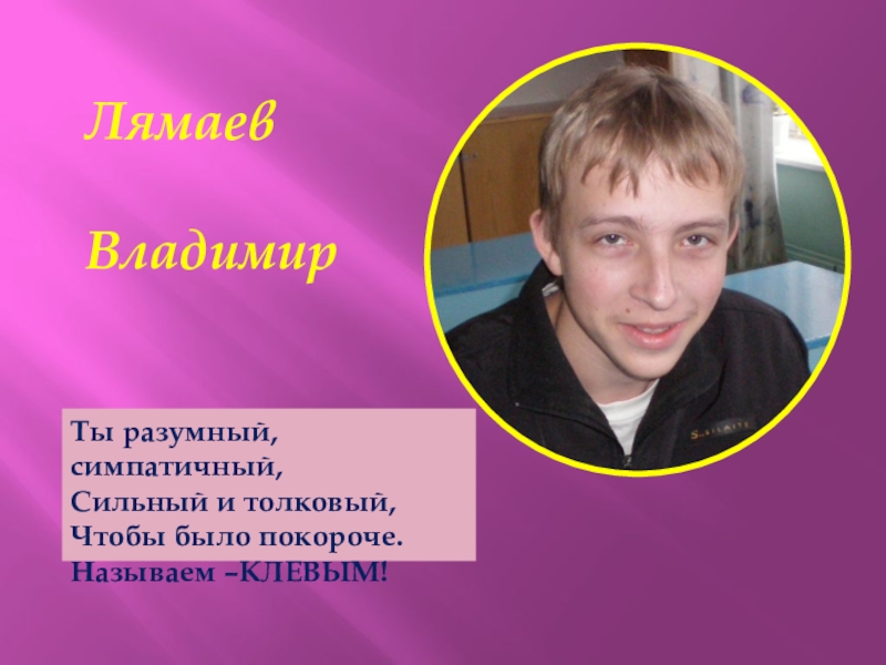 Лямаев   ВладимирТы разумный, симпатичный,Сильный и толковый,Чтобы было покороче.Называем –КЛЕВЫМ!