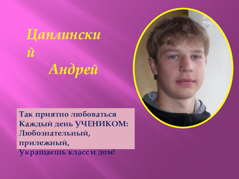 Цаплинский   АндрейТак приятно любоватьсяКаждый день УЧЕНИКОМ:Любознательный, прилежный,Украшаешь класс и дом!