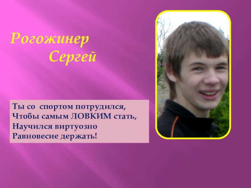 Рогожинер      СергейТы со спортом потрудился,Чтобы самым ЛОВКИМ стать,Научился виртуозноРавновесие держать!
