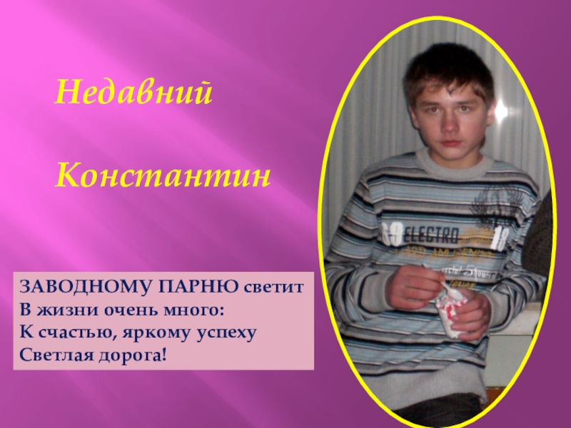 Недавний  КонстантинЗАВОДНОМУ ПАРНЮ светитВ жизни очень много:К счастью, яркому успехуСветлая дорога!