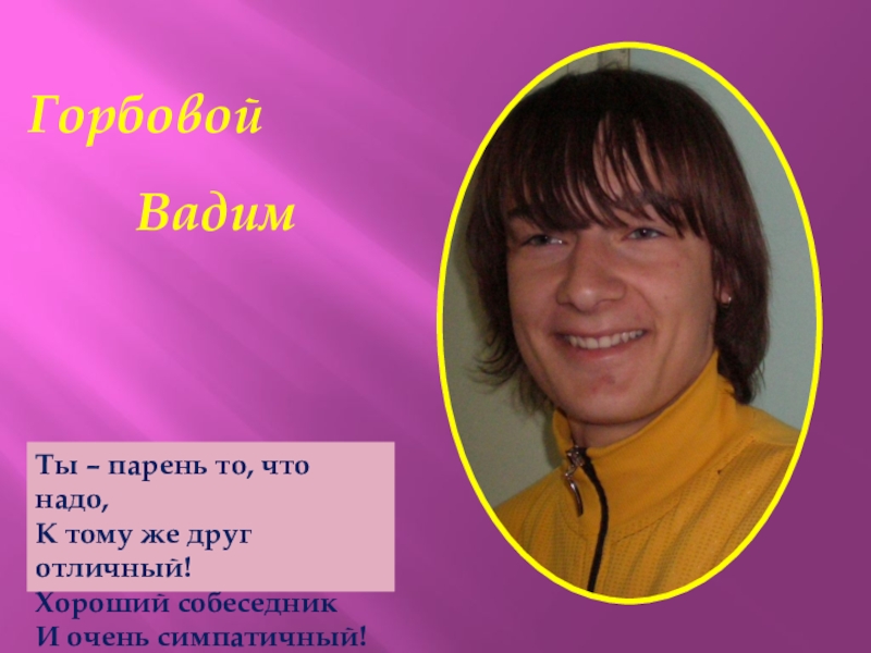 Горбовой     ВадимТы – парень то, что надо,К тому же друг отличный!Хороший собеседникИ очень