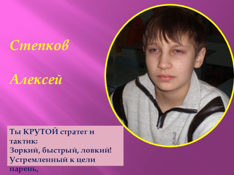 Степков    АлексейТы КРУТОЙ стратег и тактик:Зоркий, быстрый, ловкий!Устремленный к цели парень,Гордость всей тусовки!