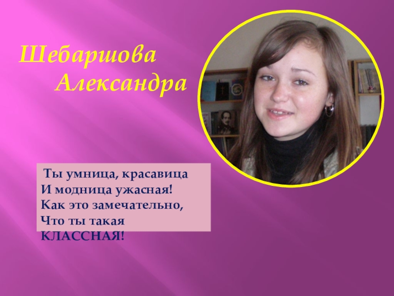 Шебаршова    Александра Ты умница, красавицаИ модница ужасная!Как это замечательно,Что ты такая КЛАССНАЯ!