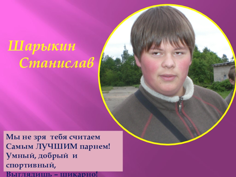 Шарыкин  СтаниславМы не зря тебя считаемСамым ЛУЧШИМ парнем!Умный, добрый и спортивный,Выглядишь – шикарно!