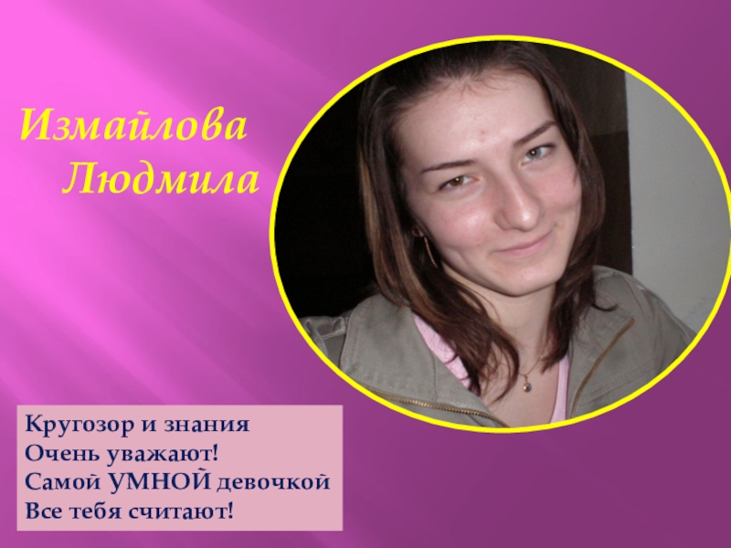 Измайлова   ЛюдмилаКругозор и знанияОчень уважают!Самой УМНОЙ девочкойВсе тебя считают!