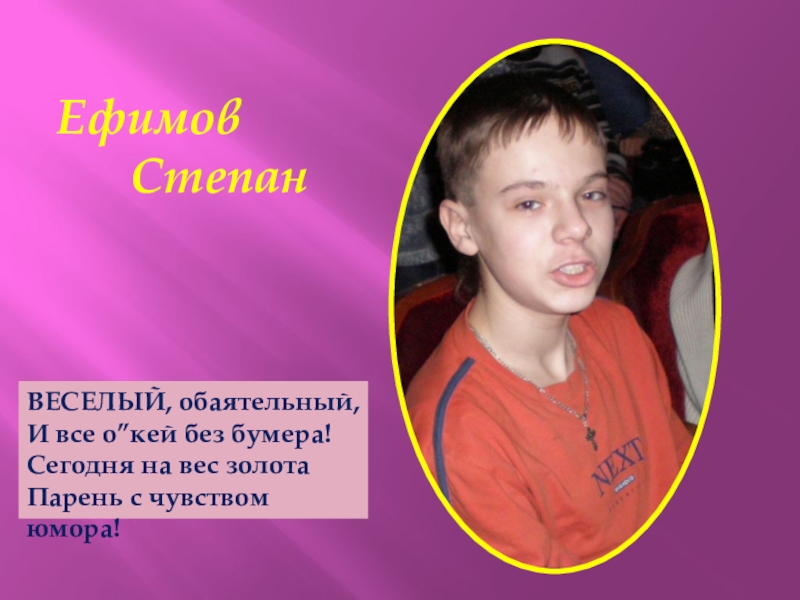 Ефимов    СтепанВЕСЕЛЫЙ, обаятельный,И все о”кей без бумера!Сегодня на вес золотаПарень с чувством юмора!