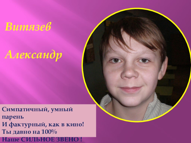 Витязев АлександрСимпатичный, умный пареньИ фактурный, как в кино!Ты давно на 100%Наше СИЛЬНОЕ ЗВЕНО !