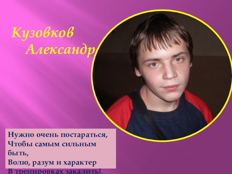 Кузовков   АлександрНужно очень постараться,Чтобы самым сильным быть,Волю, разум и характерВ тренировках закалить!
