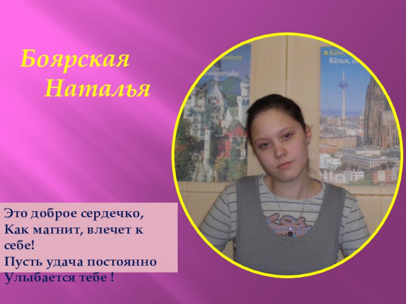 Это доброе сердечко,Как магнит, влечет к себе!Пусть удача постоянноУлыбается тебе !Боярская   Наталья
