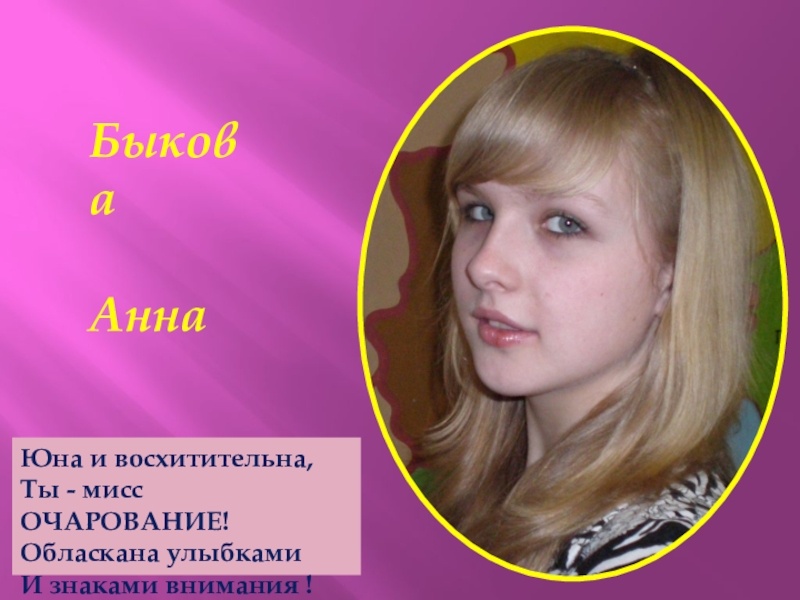 Юна и восхитительна,Ты - мисс ОЧАРОВАНИЕ!Обласкана улыбкамиИ знаками внимания !Быкова   Анна