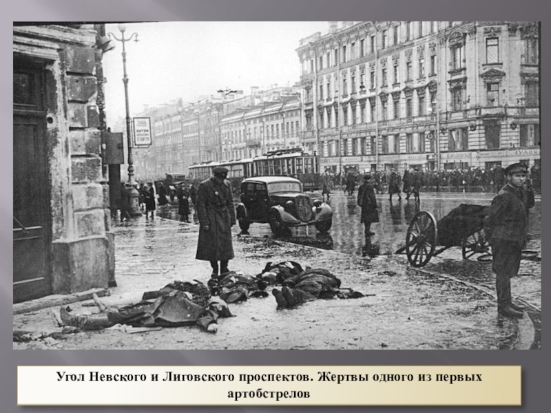 Слайд 33Угол Невского и Лиговского проспектов. Жертвы одного из первых артобстрелов