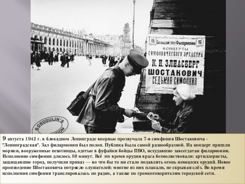 Слайд 239 августа 1942 г. в блокадном Ленинграде впервые прозвучала 7-я симфония