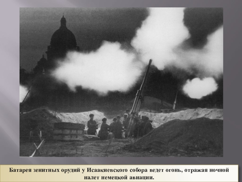 Слайд 11Батарея зенитных орудий у Исаакиевского собора ведет огонь, отражая ночной налет