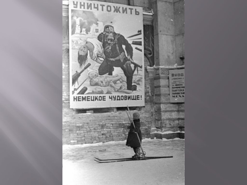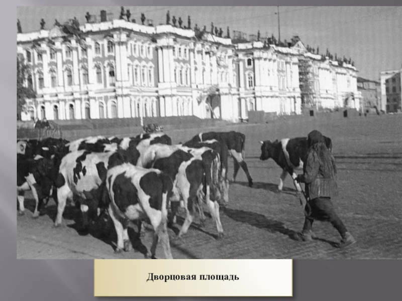 Слайд 16Голодающие ленинградцы пытаются добыть мясо, разделывая труп погибшей лошади. Одна из