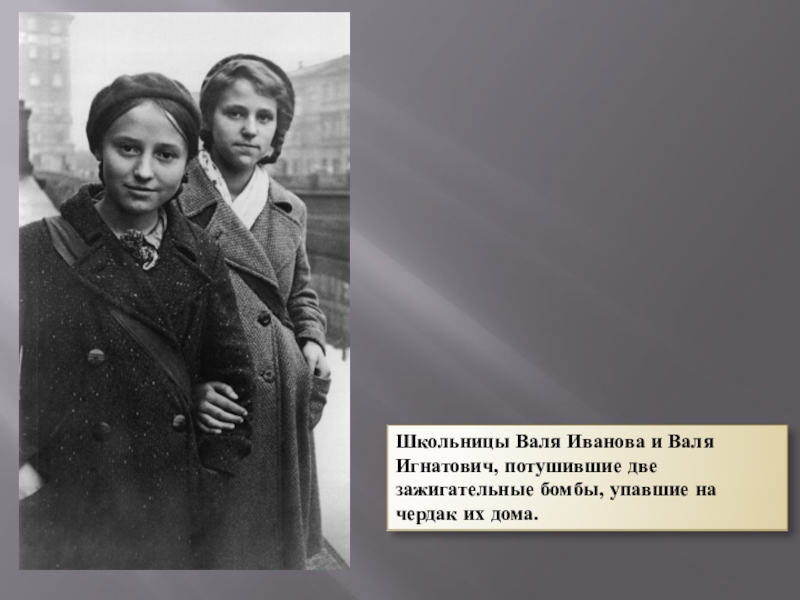 Слайд 20Школьницы Валя Иванова и Валя Игнатович, потушившие две зажигательные бомбы, упавшие