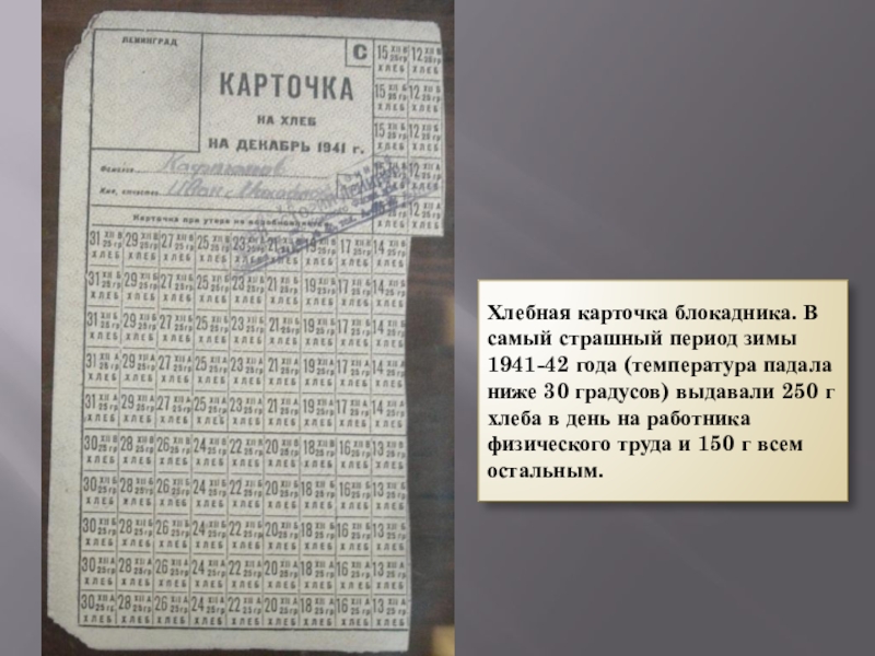 Слайд 15Хлебная карточка блокадника. В самый страшный период зимы 1941-42 года (температура