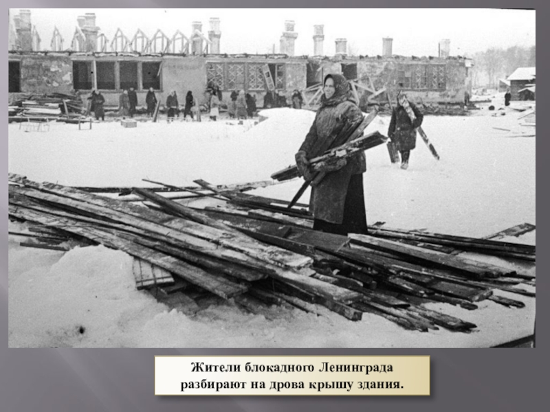 Слайд 31Жители блокадного Ленинграда разбирают на дрова крышу здания.