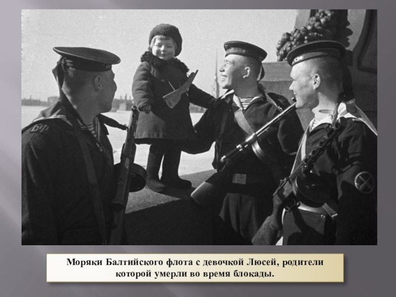 Слайд 35Моряки Балтийского флота с девочкой Люсей, родители которой умерли во время