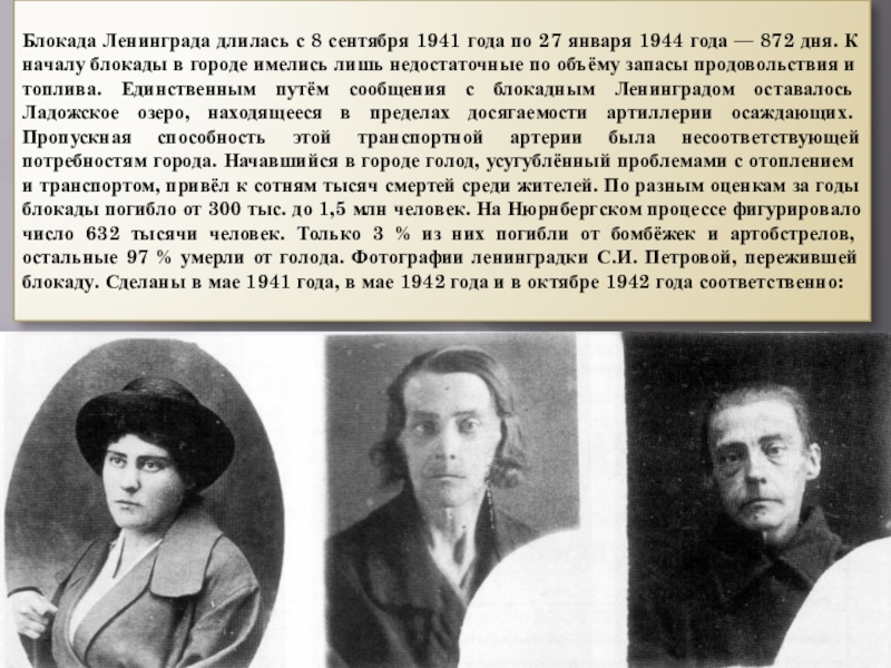 1944 года — 872 дня. К началу блокады в городе имелись лишь недостаточные по объёму запасы продовольствия и топлива. Единственным путём сообщения с блокадным Ленинградом оставалось Ладожское озеро, находящееся в пределах досягаемости артиллерии осаждающих. Пропускная способность этой транспортной артерии была несоответствующей потребностям города. Начавшийся в городе голод, усугублённый проблемами с отоплением и транспортом, привёл к сотням тысяч смертей среди жителей. По разным оценкам за годы блокады погибло от 300 тыс. до 1,5 млн человек. На Нюрнбергском процессе фигурировало число 632 тысячи человек. Только 3 % из них погибли от бомбёжек и артобстрелов, остальные 97 % умерли от голода. Фотографии ленинградки С.И. Петровой, пережившей блокаду. Сделаны в мае 1941 года, в мае 1942 года и в октябре 1942 года соответственно: