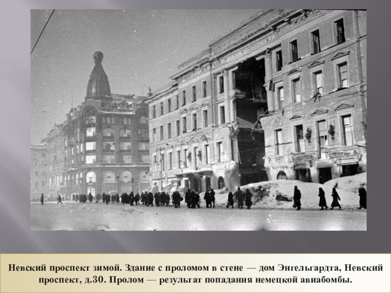 Слайд 10Невский проспект зимой. Здание с проломом в стене — дом Энгельгардта,