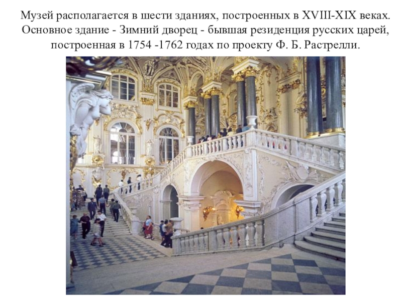 - Зимний дворец - бывшая резиденция русских царей, построенная в 1754 -1762 годах по проекту Ф. Б. Растрелли.