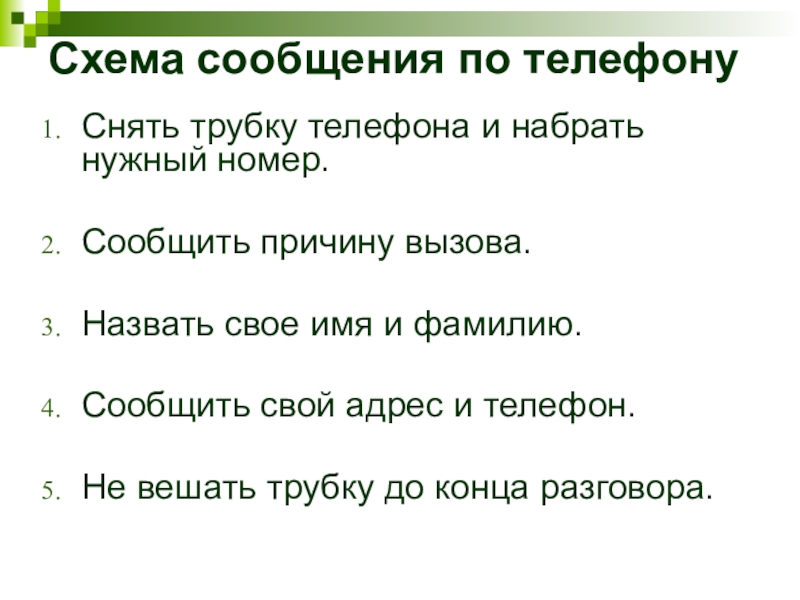 Схема сообщения по телефону Снять трубку телефона и набрать нужный номер.Сообщить причину вызова.Назвать свое имя и фамилию.Сообщить