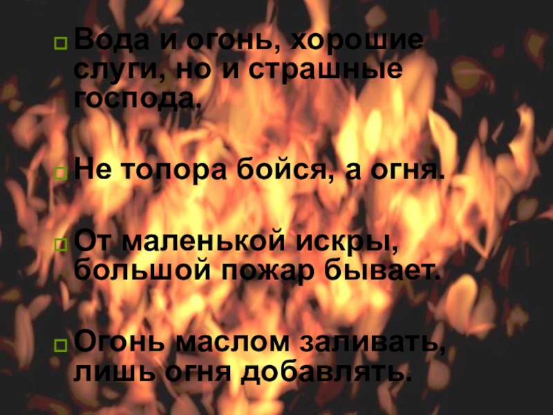Вода и огонь, хорошие слуги, но и страшные господа.Не топора бойся, а огня.От маленькой искры, большой пожар