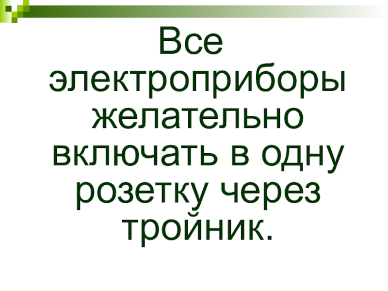 Слайд 6Все электроприборы желательно включать в одну розетку через тройник.
