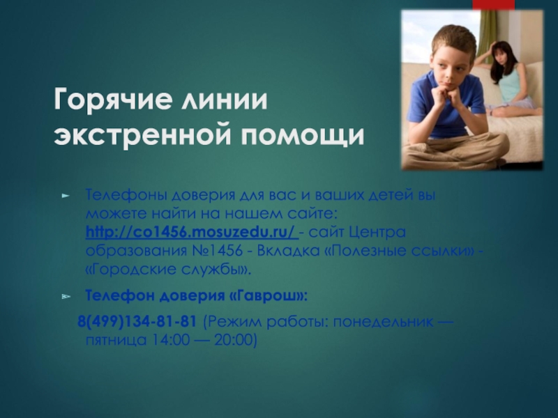 Горячие линии экстренной помощи Телефоны доверия для вас и ваших детей вы можете найти на нашем сайте: