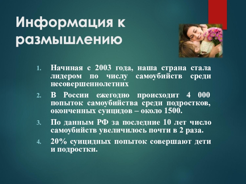 Информация к размышлениюНачиная с 2003 года, наша страна стала лидером по числу самоубийств среди несовершеннолетнихВ России ежегодно