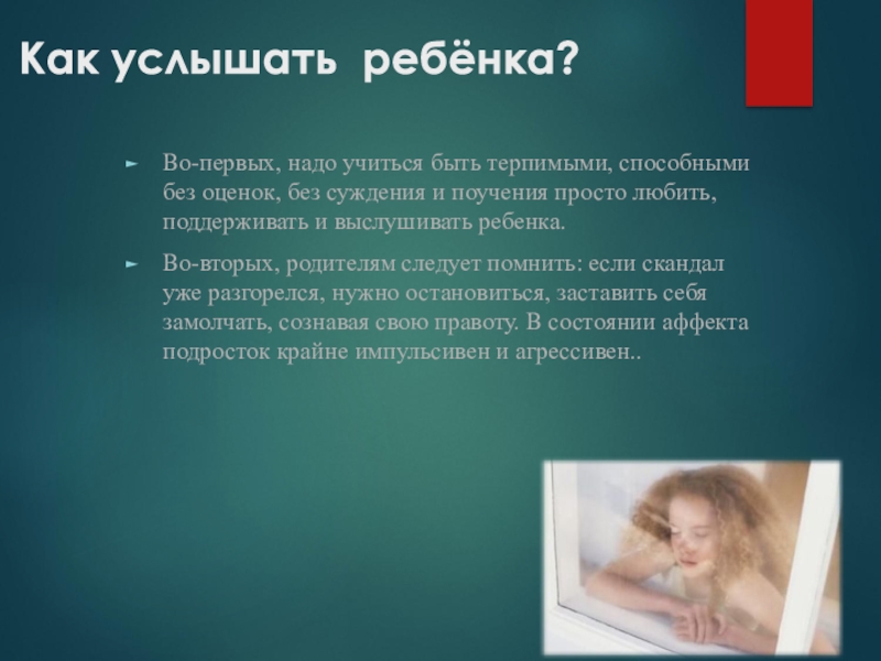 Как услышать ребёнка?Во-первых, надо учиться быть терпимыми, способными без оценок, без суждения и поучения просто любить, поддерживать