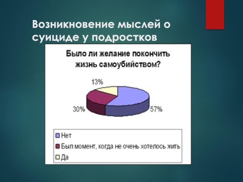 Информация к размышлениюНачиная с 2003 года, наша страна стала лидером по числу самоубийств среди несовершеннолетнихВ России ежегодно происходит 4 000 попыток самоубийства среди подростков, оконченных суицидов – около 1500.По данным РФ за последние 10 лет число