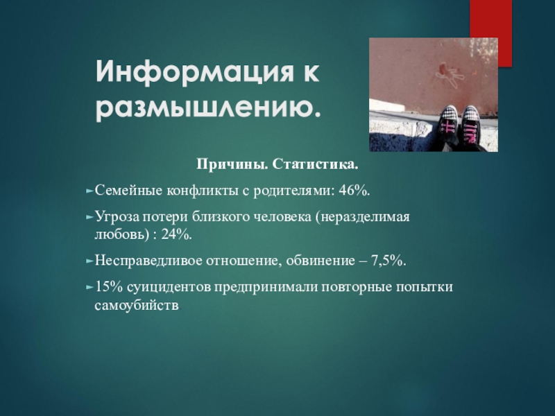 Информация к размышлению. Причины. Статистика.Семейные конфликты с родителями: 46%.Угроза потери близкого человека (неразделимая любовь) : 24%.Несправедливое отношение,