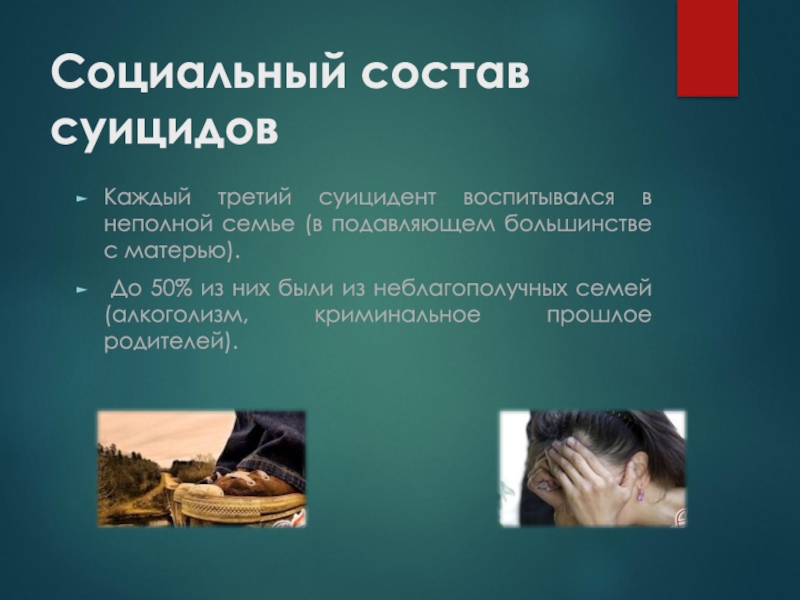 Социальный состав суицидов Каждый третий суицидент воспитывался в неполной семье (в подавляющем большинстве с матерью). До 50%