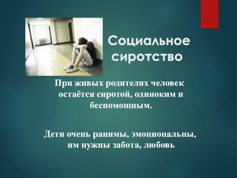 Социальное  сиротство  При живых родителях человек остаётся сиротой, одиноким и беспомощным.  Дети очень ранимы,